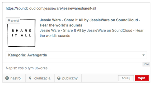 Jeżeli jesteś zarejestrowanym użytkownikiem na portalu społecznościowym Muzykosfera, musisz się na początku zalogować na swoje konto. Teraz w oknie do zamieszczania statusu wybierz utwór. Następnie podaj link do kompozycji, którą chcesz się podzielić z pozostałymi użytkownikami i przypisz piosenkę do gatunku oraz napisz coś o niej.