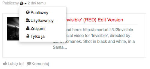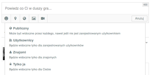 Jeżeli zapomniałeś ustawić prywatności lub chcesz ją zmienić, możesz to zrobić w każdym momencie. Wystarczy, że nad zamieszczoną treścią klikniesz ikonę kuli ziemskiej i wybierzesz następujące ustawienia: