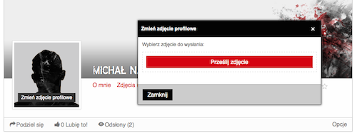 Zdjęcie profilowe możesz również zmienić w widoku swojego profilu. W tym celu wybierz z menu Muzykosfery pozycję Profil. Następnie najedź kursorem na swoje zdjęcie profilowe aż pojawi się przycisk "Zmień zdjęcie profilowe". Jeżeli chcesz je zmienić kliknij na przycisk a pojawi się okno, które umożliwi Tobie zmianę zdjęcia profilowego.