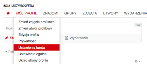 Jeżeli jesteś zarejestrowanym użytkownikiem na portalu społecznościowym Muzykosfera, musisz się na początku zalogować na swoje konto. Następnie wybierz z pozycji menu Profil i Ustawienia konta.